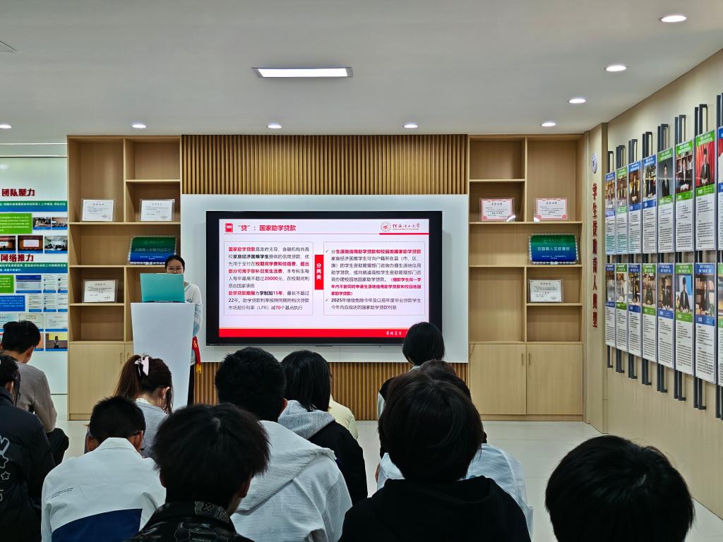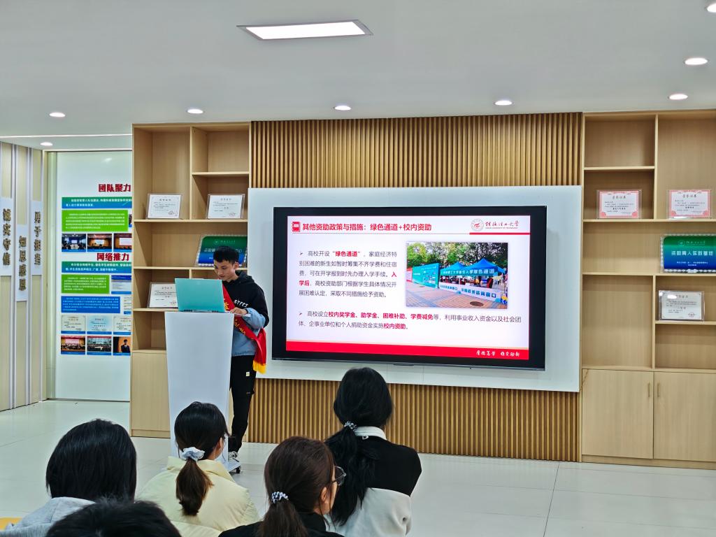 在学校资助育人实践基地开展资助政策宣讲活动,资助宣传大使何灿丽、韦砚俊、陆鹏飞、杨兰雨等4位同学为100余名学生进行了深入细致的政策宣讲。