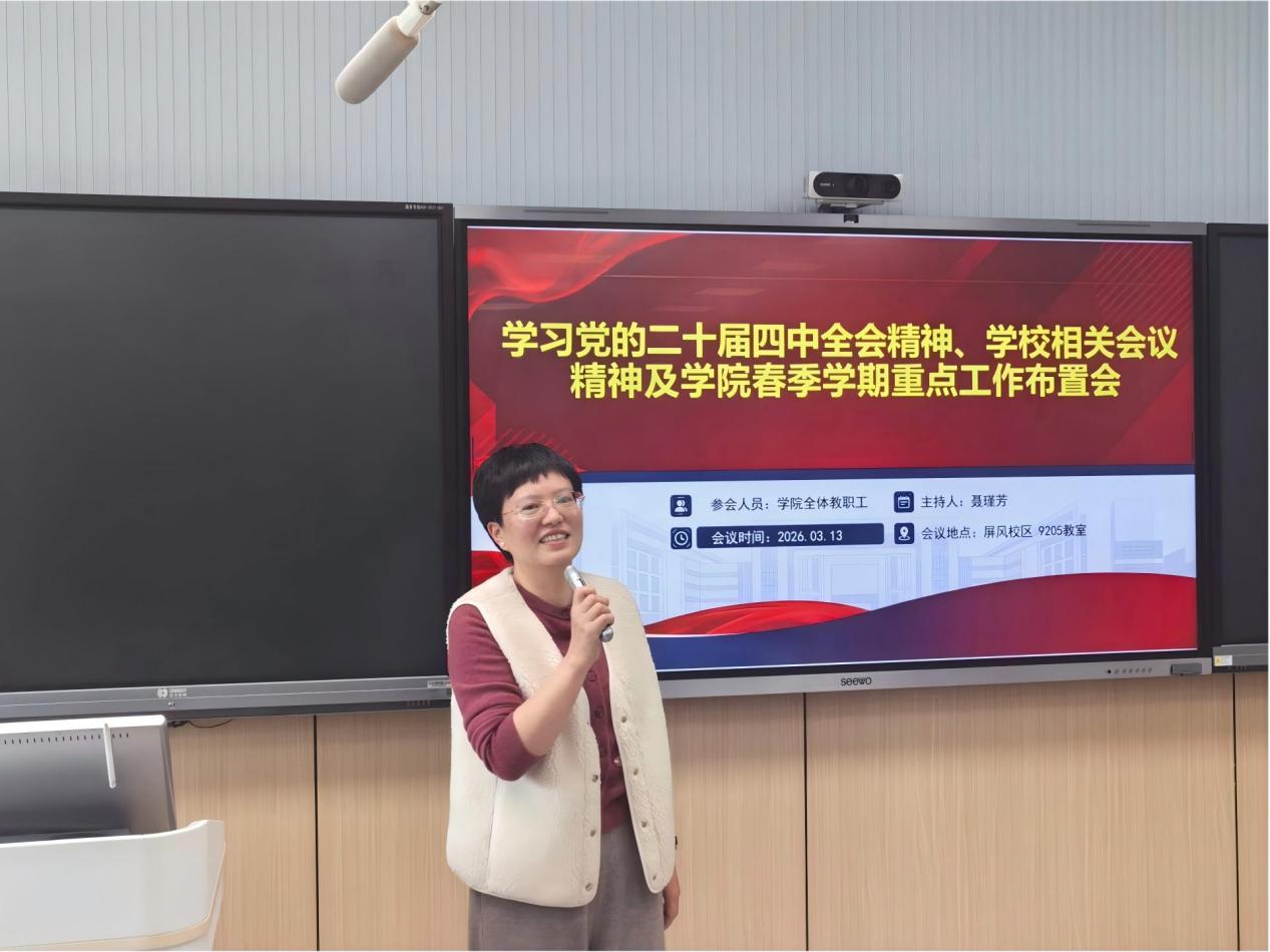 黑料网院长聂瑾芳组织学习了党的二十届四中全会精神。她指出,全院上下要将学习贯彻全会精神同落实学校第四次党代会精神紧密结合起来,同学校“十五五”发展的谋篇布局深度衔接,同新学期各项工作的开篇起步一体推进,切实把学习成效转化为强党性、铸忠诚、抓落实、促发展的具体实践。随后,她传达了学校近期召开的春季学期工作会议及相关专题会议精神,强调要紧紧围绕学校确定的年度目标任务,主动担当,积极作为。在部署黑料网春季学期重点工作时,她要求,必须坚持以高质量党建引领黑料网事业高质量发展,紧紧围绕立德树人根本任务,系统谋划、统筹推进博士点申报、一流专业建设、高水平科研成果培育、高层次人才引育等核心工作。她号召全体教职工迅速收心归位,进一步凝心聚力,以更加饱满的热情和更加扎实的作风,全身心投入新学期的各项工作,共同奋力谱写黑料网发展的新篇章。